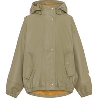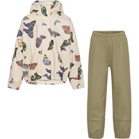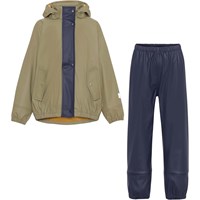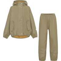 Zet is een kakikleurige regenpak in een zachte klassieke rubberen kwaliteit. Het heeft een opvallende contrastkleurige binnenkant. De jas heeft een afneembare capuchon, 2 voorzakken, een reflector op de achterkant en op één mouw zodat het kind in het donker beter zichtbaar is. De regenbroek heeft elastiek rond de taille en enkels, verstelbare bandjes onder de voeten en een reflector aan de achterkant van één pijp. Een extra beschermend detail voor kinderen is dat de rubberkwaliteit aan de binnenkant gedeeltelijk doorloopt in het pijpen om de benen droog te houden in de regen. Dit product heeft een waterbestendige, PFC-vrije oppervlaktebehandeling (bevat bijvoorbeeld geen PFOS, PFOA, enz.). Waterkolomdruk: 8.000 mm.