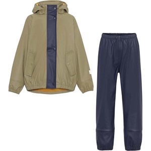 Zet is een regenpak in een zachte klassieke rubberen kwaliteit, de jas is donkerblauw en kaki en de broek is donkerblauw. Het heeft een opvallende contrastkleurige binnenkant. De jas heeft een afneembare capuchon, 2 voorzakken, een reflector op de achterkant en op één mouw zodat het kind in het donker beter zichtbaar is. De regenbroek heeft elastiek rond de taille en enkels, verstelbare bandjes onder de voeten en een reflector aan de achterkant van één pijp. Een extra beschermend detail voor kinderen is dat de rubberkwaliteit aan de binnenkant gedeeltelijk doorloopt in het pijpen om de benen droog te houden in de regen. Dit product heeft een waterbestendige, PFC-vrije oppervlaktebehandeling (bevat bijvoorbeeld geen PFOS, PFOA, enz.). Waterkolomdruk: 8.000 mm.