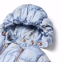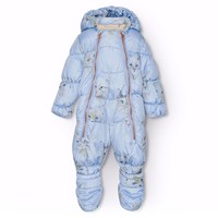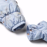 Waterafstotend lichtblauw baby skipak met aquarel geschilderde poezengezichten van gerecycled polyester. Het skipak is geschikt voor koudere dagen in de kinderwagen. Het heeft twee ritsen aan de voorkant, waardoor het gemakkelijk aan en uit te trekken is. Daarnaast heeft het een afneembare capuchon en kleine afneembare slofjes die kunnen worden vastgeknoopt en losgemaakt. Het heeft ook een fleece voering en elastiek in de mouw- en beenopeningen, waardoor wanten, sokken en laarzen op hun plaats blijven en bescherming bieden tegen wind en weer.