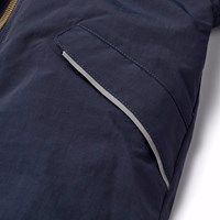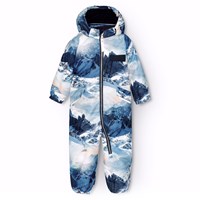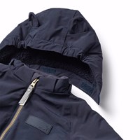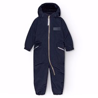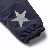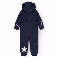 Donkerblauwe warme skipak voor baby's en peuters van gerecycled polyester. Het skipak heeft een afneembare gevoerde capuchon en een extra lange en waterdichte rits aan de voorkant, om sneeuw, wind en water buiten te houden en het gemakkelijk aan te trekken. Het skipak heeft elastiek rond de taille, mouwen en broekspijpen om sneeuw, regen en wind buiten te houden en om wanten en laarzen niet te verliezen. Het skipak heeft reflectoren op de zakken en mouwen en een grote reflector in de vorm van een ster op het been om de zichtbaarheid in het verkeer te vergroten. Het skipak heeft gevoerde voorzakken en een verstelbare elastiek in de taille aan de binnenkant voor vorm en aansluiting rond het lichaam.