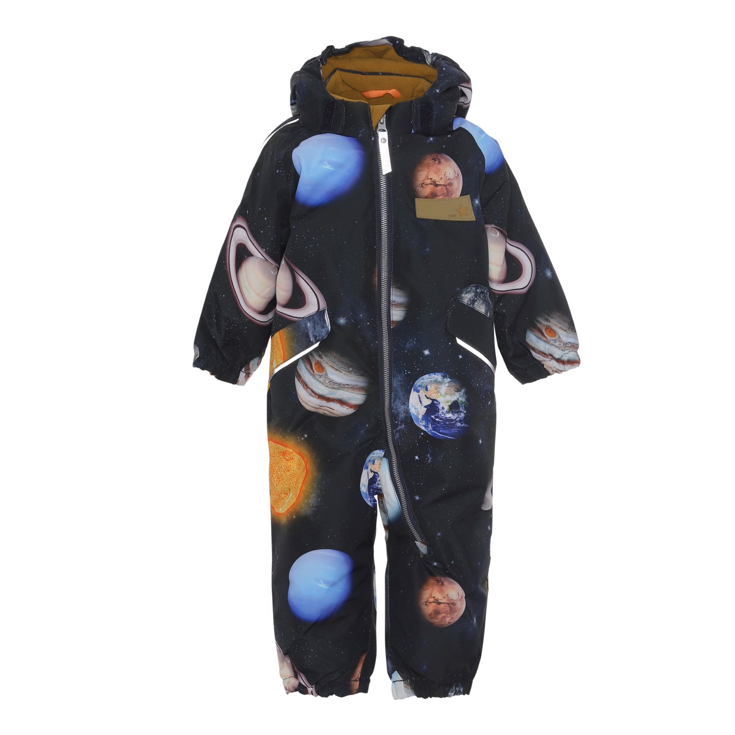 Hyde is Molo's nieuwe, donkerblauwe unisex skipak met planeten voor kleine kinderen. Hyde maakt deel uit van Molo's Outdoor-Proof lijn voor actieve kinderen. Het skipak is perfect voor matig koude winterdagen. Op zeer koude dagen, draag je Hyde met een heerlijk warme fleece eronder. Het skipak heeft reflecterende biezen en Molo's iconische sterreflectoren aan de zijkant en achterkant. Het heeft een schuine ritssluiting aan de voorkant. Hyde is wind-, waterdicht, ademend en heeft getapete naden. Dit product heeft een waterbestendige, PFC-vrije oppervlaktebehandeling (Bevat bijvoorbeeld geen PFOS, PFOA, etc). Waterkolomdruk: 12.000 mm. Ademend: 8.000 g/m2/24u.