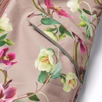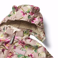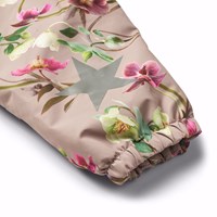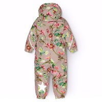 Warme skipak voor baby's en peuters van gerecycled polyester met een print van kerstrozen in witte en lichtroze tinten die prachtige vertakken met groene bladeren op een mokka kleurige achtergrond. Het skipak heeft een afneembare gevoerde capuchon en een extra lange en waterdichte rits aan de voorkant, om sneeuw, wind en water buiten te houden en het gemakkelijk aan te trekken. Het skipak heeft elastiek rond de taille, mouwen en broekspijpen om sneeuw, regen en wind buiten te houden en om wanten en laarzen niet te verliezen. Het skipak heeft reflectoren op de zakken en mouwen en een grote reflector in de vorm van een ster op het been om de zichtbaarheid in het verkeer te vergroten. Het skipak heeft gevoerde voorzakken en een verstelbare elastiek in de taille aan de binnenkant voor vorm en aansluiting rond het lichaam.