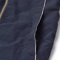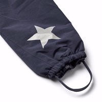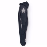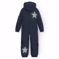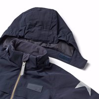 Donkerblauwe skipak van gerecycled polyester voor een koude winter. Het skipak heeft een afneembare gevoerde capuchon en een waterdichte rits aan de voorkant om wind en water buiten te houden. Het heeft elastiek in de taille, mouwen en broekspijpen om sneeuw, regen en wind buiten te houden en om wanten en laarzen aan te houden. Het skipak heeft reflectoren langs de zijnaden en grote ster-vormige reflectoren op de mouwen, broekspijpen en achterkant om de zichtbaarheid in het verkeer te vergroten. Het heeft gevoerde zijzakken en een verstelbare elastische tailleband aan de binnenkant voor vorm en aansluiting rond het lichaam.