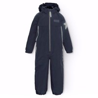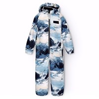 Skipak van gerecycled polyester voor een koude winter met een print van een winterlandschap in verschillende tinten blauw. Het skipak heeft een afneembare gevoerde capuchon en een waterdichte rits aan de voorkant om wind en water buiten te houden. Het heeft elastiek in de taille, mouwen en broekspijpen om sneeuw, regen en wind buiten te houden en om wanten en laarzen aan te houden. Het skipak heeft reflectoren langs de zijnaden en grote ster-vormige reflectoren op de mouwen, broekspijpen en achterkant om de zichtbaarheid in het verkeer te vergroten. Het heeft gevoerde zijzakken en een verstelbare elastische tailleband aan de binnenkant voor vorm en aansluiting rond het lichaam.
