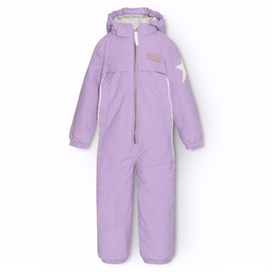 Paarse skipak van gerecycled polyester voor een koude winter. Het skipak heeft een afneembare gevoerde capuchon en een waterdichte rits aan de voorkant om wind en water buiten te houden. Het heeft elastiek in de taille, mouwen en broekspijpen om sneeuw, regen en wind buiten te houden en om wanten en laarzen aan te houden. Het skipak heeft reflectoren langs de zijnaden en grote ster-vormige reflectoren op de mouwen, broekspijpen en achterkant om de zichtbaarheid in het verkeer te vergroten. Het heeft gevoerde zijzakken en een verstelbare elastische tailleband aan de binnenkant voor vorm en aansluiting rond het lichaam.