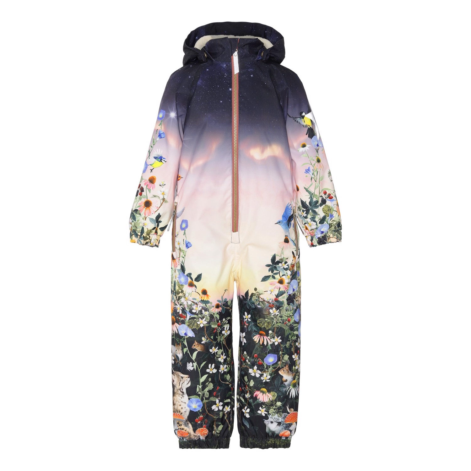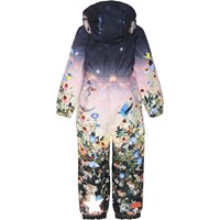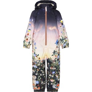 Polar is een nieuw skipak met een prachtige print met bloemen en dieren aan de onderkant en met een avondlucht aan de bovenkant. Polar heeft Molo's iconische sterreflectoren op de mouw en de pijp, sneeuwflappen en rubberen bandjes aan het einde van de pijpen. Het skipak is wind-, waterdicht, ademend en heeft getapete naden. Dit product heeft een waterbestendige, PFC-vrije oppervlaktebehandeling (Bevat bijvoorbeeld geen PFOS, PFOA, etc). Waterkolomdruk: 12.000 mm. Ademend: 8.000 g/m2/24u.