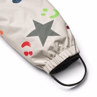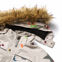 Beige wind- en waterdichte skipak met een print van kleurrijke lachende gezichten gemaakt van gerecycled polyester. Het skipak heeft een afneembare gevoerde capuchon met afneembare imitatiebont, voorzakken met windkleppen, voorritsen met stormkleppen en kinbescherming om te voorkomen dat de huid vast komt te zitten. Het skipak heeft interne elastische banden en elastiek rond de opening van de mouwen en pijpen om ervoor te zorgen dat het goed past en sneeuw, regen en wind buiten houdt. Het skipak is uitgerust met reflecterende tape en twee grote sterren op de pijpen voor zichtbaarheid in het verkeer. Bovendien is het skipak gevoerd met gerecycled polyester fleece op blootgestelde gebieden en gevoerd met 3M™ Thinsulate™, wat helpt om warmte vast te houden.