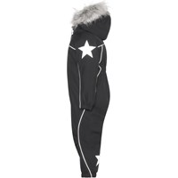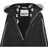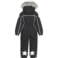 Polaris Fur is een favoriet van Molo als het weer erg koud wordt. Polaris is ,naast al zijn vele bekende kwaliteiten, nu ook gemaakt van gedeeltelijk gerecyclede materialen. Dit betekent dat de buitenstof 51% gerecycled is en de voering en tussenvoering 100% gemaakt is van gerecycled polyester. Polaris is een functionele zwarte skipak met reflecterende biezen en afneembare rand van nepbont. Het skipak heeft ook een afneembare capuchon, een ritssluiting met overslag en drukknopen aan de voorkant, Molo's iconische sterreflectoren op de mouwen en pijpen. Het heeft sneeuwflappen bij de pijpen en rubberen banden voor onder de voeten. Het skipak is gemaakt van een ademende en wind- en waterdichte stof en heeft getapete naden. Dit product heeft een waterbestendige, PFC-vrije oppervlaktebehandeling (bevat bijvoorbeeld geen PFOS, PFOA, etc) en daarom is het skipak 'Best-in-Test' genoemd. De waterkolomdruk en het ademend vermogen zijn sterk verbeterd en zijn nu: waterkolomdruk: 15.000 mm en ademend: 15.000 g / m2 / 24 uur.