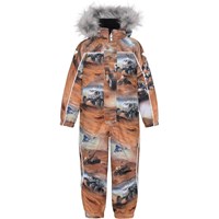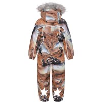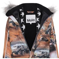 Polaris Fur is een favoriet van Molo als het weer erg koud wordt. Polaris is ,naast al zijn vele bekende kwaliteiten, nu ook gemaakt van gedeeltelijk gerecyclede materialen. Dit betekent dat de buitenstof 51% gerecycled is en de voering en tussenvoering 100% gemaakt is van gerecycled polyester. Polaris is een functionele bruine skipak met een print van Mars. Het heeft reflecterende biezen en afneembare rand van nepbont. Het skipak heeft ook een afneembare capuchon, een ritssluiting met overslag en drukknopen aan de voorkant, Molo's iconische sterreflectoren op de mouwen en pijpen. Het heeft sneeuwflappen bij de pijpen en rubberen banden voor onder de voeten. Het skipak is gemaakt van een ademende en wind- en waterdichte stof en heeft getapete naden. Dit product heeft een waterbestendige, PFC-vrije oppervlaktebehandeling (bevat bijvoorbeeld geen PFOS, PFOA, etc) en daarom is het skipak 'Best-in-Test' genoemd. De waterkolomdruk en het ademend vermogen zijn sterk verbeterd en zijn nu: waterkolomdruk: 15.000 mm en ademend: 15.000 g / m2 / 24 uur.