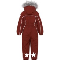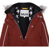 Polaris Fur is een favoriet van Molo als het weer erg koud wordt. Polaris is ,naast al zijn vele bekende kwaliteiten, nu ook gemaakt van gedeeltelijk gerecyclede materialen. Dit betekent dat de buitenstof 51% gerecycled is en de voering en tussenvoering 100% gemaakt is van gerecycled polyester. Polaris is een functionele donkerrode skipak. Het heeft reflecterende biezen en afneembare rand van nepbont. Het skipak heeft ook een afneembare capuchon, een ritssluiting met overslag en drukknopen aan de voorkant, Molo's iconische sterreflectoren op de mouwen en pijpen. Het heeft sneeuwflappen bij de pijpen en rubberen banden voor onder de voeten. Het skipak is gemaakt van een ademende en wind- en waterdichte stof en heeft getapete naden. Dit product heeft een waterbestendige, PFC-vrije oppervlaktebehandeling (bevat bijvoorbeeld geen PFOS, PFOA, etc) en daarom is het skipak 'Best-in-Test' genoemd. De waterkolomdruk en het ademend vermogen zijn sterk verbeterd en zijn nu: waterkolomdruk: 15.000 mm en ademend: 15.000 g / m2 / 24 uur.