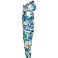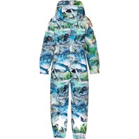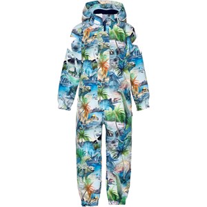 Blauw-groen softshelldrag gemaakt van gerecycled polyester met een opvallende print van dinosaurussen, palmbomen en natuur. De drag is ongevoerd en daardoor ideaal voor overgangsseizoenen, biedt bescherming tegen wind en regen, en geeft veel bewegingsvrijheid. Het heeft een afneembare capuchon, ritssluiting met kinbeschermer, elastiek in de taille voor een goede pasvorm, en reflecterende elementen op de mouwen, benen en capuchon voor extra zichtbaarheid in het verkeer.