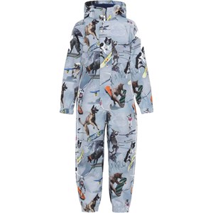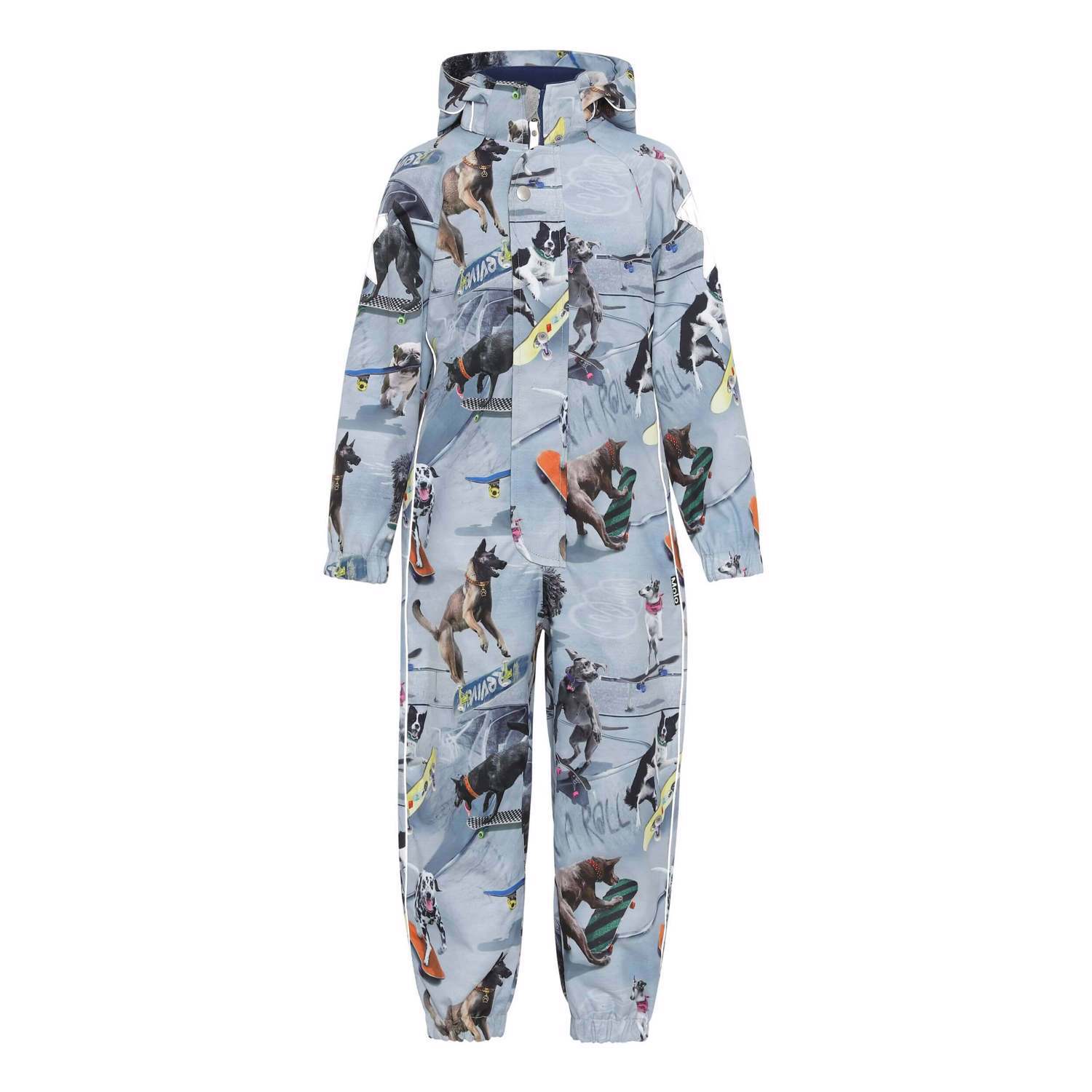 Functioneel pak dat lichtgewicht en ongevoerd is met een leuke print van skatende honden. Het pak is gemaakt van een duurzame stof die is gemaakt van 100% gerecycled polyester van plastic flessen. Het heeft een afneembare capuchon, een afgedekte ritssluiting aan de voorkant om te beschermen tegen wind en regen en elastiek aan de achterkant van de taille, rond de mouwen en pijpen. Het heeft ook verschillende reflectoren. Dit pak is perfect voor alle weersomstandigheden omdat de stof waterdicht en ademend is en getapete naden heeft. Dit product heeft een waterbestendige, PFC-vrije oppervlaktebehandeling (bevat bijvoorbeeld geen PF OS, PFOA, enz.). Waterkolomdruk: 5.000 mm. ademend: 5.000 g/m2/24u.