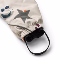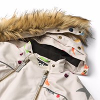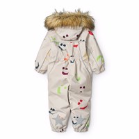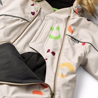 Beige wind- en waterdichte skipak voor een koude winter met een print van kleurrijke lachende gezichten gemaakt van gerecycled polyester. Het skipak heeft een afneembare gevoerde capuchon met afneembare imitatiebont, twee ritsen aan de voorkant en een rib kinbeschermer om te voorkomen dat de huid vast komt te zitten. Het skipak heeft een binnenwindflap en elastiek rond de taille, mouwen en pijpen om sneeuw, regen en wind buiten te houden. Het skipak is voorzien van reflecterende tape langs de zijnaden, rond de capuchon en twee grote sterren op de pijpen, wat zorgt voor zichtbaarheid in het verkeer. Daarnaast is de jas gevoerd met gerecycled polyester fleece en 3M™ Thinsulate™, wat helpt om warmte vast te houden.