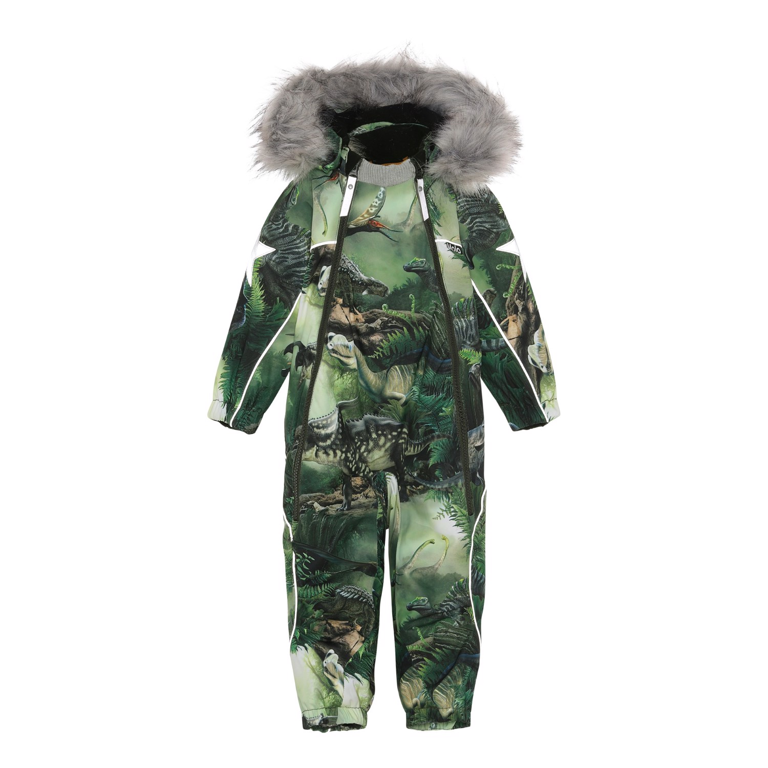 Pyxis is een groene functioneel skipak voor baby's en kleine kinderen met een dinosaurusprint. Pyxis is perfect voor extreem koude dagen maar ook voor gewone winterdagen. Het hoog ademend vermogen helpt bij het reguleren van de lichaamstemperatuur van het kind, zodat het niet te koud of oververhit raakt. Op warmere winterdagen kan het kind een dunne onderlaag dragen en op extreem koude dagen kan je een extra laag aantrekken. Ook voor minder actieve momenten is Pyxsis een goede keuze. Het heeft een afneembare capuchon, twee schuine ritsen voor gemakkelijk aankleden, sneeuwflappen aan de pijpen en rubberen bandjes. Pyxis heeft Molo's iconische sterreflectoren op de bovenmouwen en op de achterkant van de pijpen. Het skipak is wind-, waterdicht en ademend. De buitenstof is gemaakt van 45% gerecycled polyester, de 3M™ Thinsulate™ voering is gemaakt van 83% gerecycled polyester en de binnenstof is gemaakt van 100% gerecycled nylon. Het skipak heeft getapete naden. Dit product heeft een waterbestendige, PFC-vrije oppervlaktebehandeling (Bevat bijvoorbeeld geen PFOS, PFOA, etc). Waterkolomdruk: 15.000 mm. Ademend: 15.000 g/m2/24u.