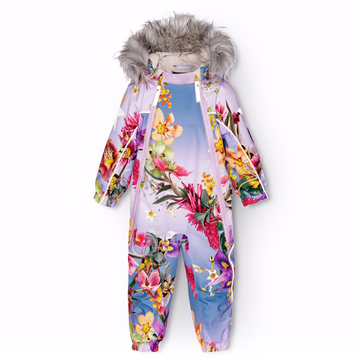 Skipak van gerecycled polyester voor een koude winter met een print van mooie bloemen in frisse kleuren op een achtergrond van blauwe en paarse tinten. Het skipak heeft een afneembare capuchon met fleece, twee ritsen met een fleece-gevoerde kinbeschermer om te voorkomen dat de huid beschadigd. Het skipak heeft een binnenwindflap en elastiek bij de taille, mouwen en pijpopeningen om sneeuw, regen en wind buiten te houden. Het pak heeft reflectoren langs de zijnaden, rond de capuchon en grote reflecterende sterren op zowel de mouwen als de pijpen om de zichtbaarheid in het verkeer te vergroten. Het pak is gevoerd met 3M™ Thinsulate™, dat lichtgewicht is en meer bewegingsvrijheid biedt voor je kind.