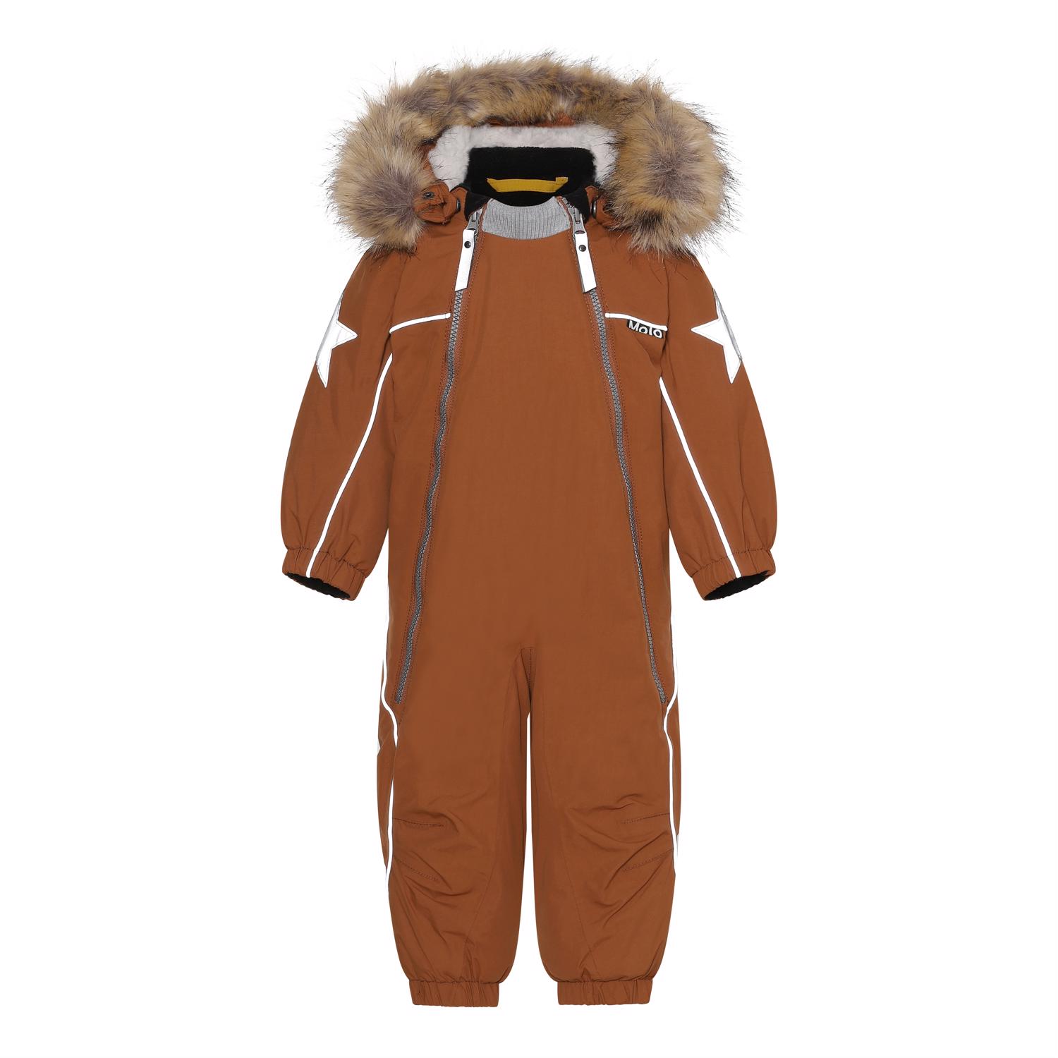 Pyxis is een bruine functionele skipak voor baby's en kleine kinderen. Het heeft een afneembare capuchon en twee schuine ritsen aan de voorkant waardoor het aan- en uittrekken gemakkelijk is. Het heeft sneeuwflappen bij de pijpen en een rubberen band voor onder de voeten. Het heeft Molo's iconische sterreflectoren op de bovenkant van de mouwen en op de achterkant van de pijpen. Het skipak is gemaakt van een ademende en wind- en waterdichte stof en de voering en tussenvoering zijn gerecycled en gemaakt van gerecycled polyester. Het skipak heeft getapete naden. Dit product heeft een waterbestendige, PFC-vrije oppervlaktebehandeling (bevat bv. geen PFOS, PFOA, enz.). De waterkolomdruk en het ademend vermogen zijn sterk verbeterd en zijn nu: waterkolomdruk: 15.000 mm en ademend: 15.000 g / m2 / 24 uur.