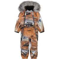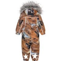 Pyxis is een bruine functionele skipak voor baby's en kleine kinderen met een print van Mars. Het heeft een afneembare capuchon en twee schuine ritsen aan de voorkant waardoor het aan- en uittrekken gemakkelijk is. Het heeft sneeuwflappen bij de pijpen en een rubberen band voor onder de voeten. Het heeft Molo's iconische sterreflectoren op de bovenkant van de mouwen en op de achterkant van de pijpen. Het skipak is gemaakt van een ademende en wind- en waterdichte stof en de voering en tussenvoering zijn gerecycled en gemaakt van gerecycled polyester. Het skipak heeft getapete naden. Dit product heeft een waterbestendige, PFC-vrije oppervlaktebehandeling (bevat bv. geen PFOS, PFOA, enz.). De waterkolomdruk en het ademend vermogen zijn sterk verbeterd en zijn nu: waterkolomdruk: 15.000 mm en ademend: 15.000 g / m2 / 24 uur.