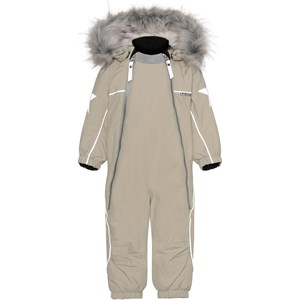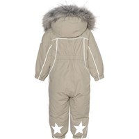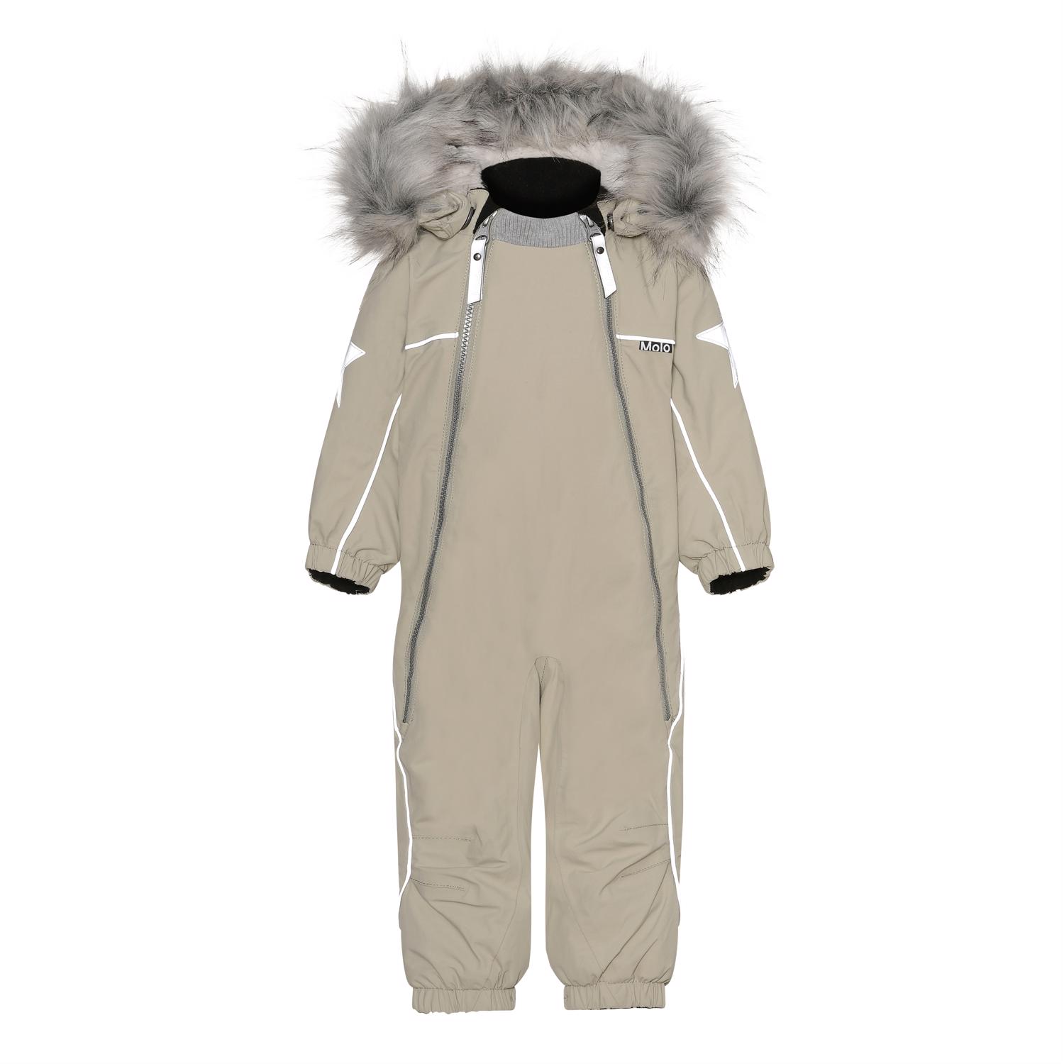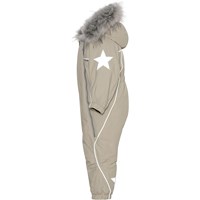 Pyxis is een beige functionele skipak voor baby's en kleine kinderen. Het heeft een afneembare capuchon en twee schuine ritsen aan de voorkant waardoor het aan- en uittrekken gemakkelijk is. Het heeft sneeuwflappen bij de pijpen en een rubberen band voor onder de voeten. Het heeft Molo's iconische sterreflectoren op de bovenkant van de mouwen en op de achterkant van de pijpen. Het skipak is gemaakt van een ademende en wind- en waterdichte stof en de voering en tussenvoering zijn gerecycled en gemaakt van gerecycled polyester. Het skipak heeft getapete naden. Dit product heeft een waterbestendige, PFC-vrije oppervlaktebehandeling (bevat bv. geen PFOS, PFOA, enz.). De waterkolomdruk en het ademend vermogen zijn sterk verbeterd en zijn nu: waterkolomdruk: 15.000 mm en ademend: 15.000 g / m2 / 24 uur.