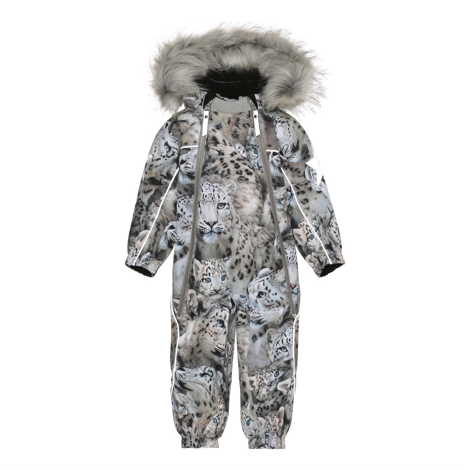 Pyxis is een grijze functionele skipak voor baby's en kleine kinderen met een print van sneeuwluipaarden. Het heeft een afneembare capuchon en twee schuine ritsen aan de voorkant waardoor het aan- en uittrekken gemakkelijk is. Het heeft sneeuwflappen bij de pijpen en een rubberen band voor onder de voeten. Het heeft Molo's iconische sterreflectoren op de bovenkant van de mouwen en op de achterkant van de pijpen. Het skipak is gemaakt van een ademende en wind- en waterdichte stof en de voering en tussenvoering zijn gerecycled en gemaakt van gerecycled polyester. Het skipak heeft getapete naden. Dit product heeft een waterbestendige, PFC-vrije oppervlaktebehandeling (bevat bv. geen PFOS, PFOA, enz.). De waterkolomdruk en het ademend vermogen zijn sterk verbeterd en zijn nu: waterkolomdruk: 15.000 mm en ademend: 15.000 g / m2 / 24 uur.