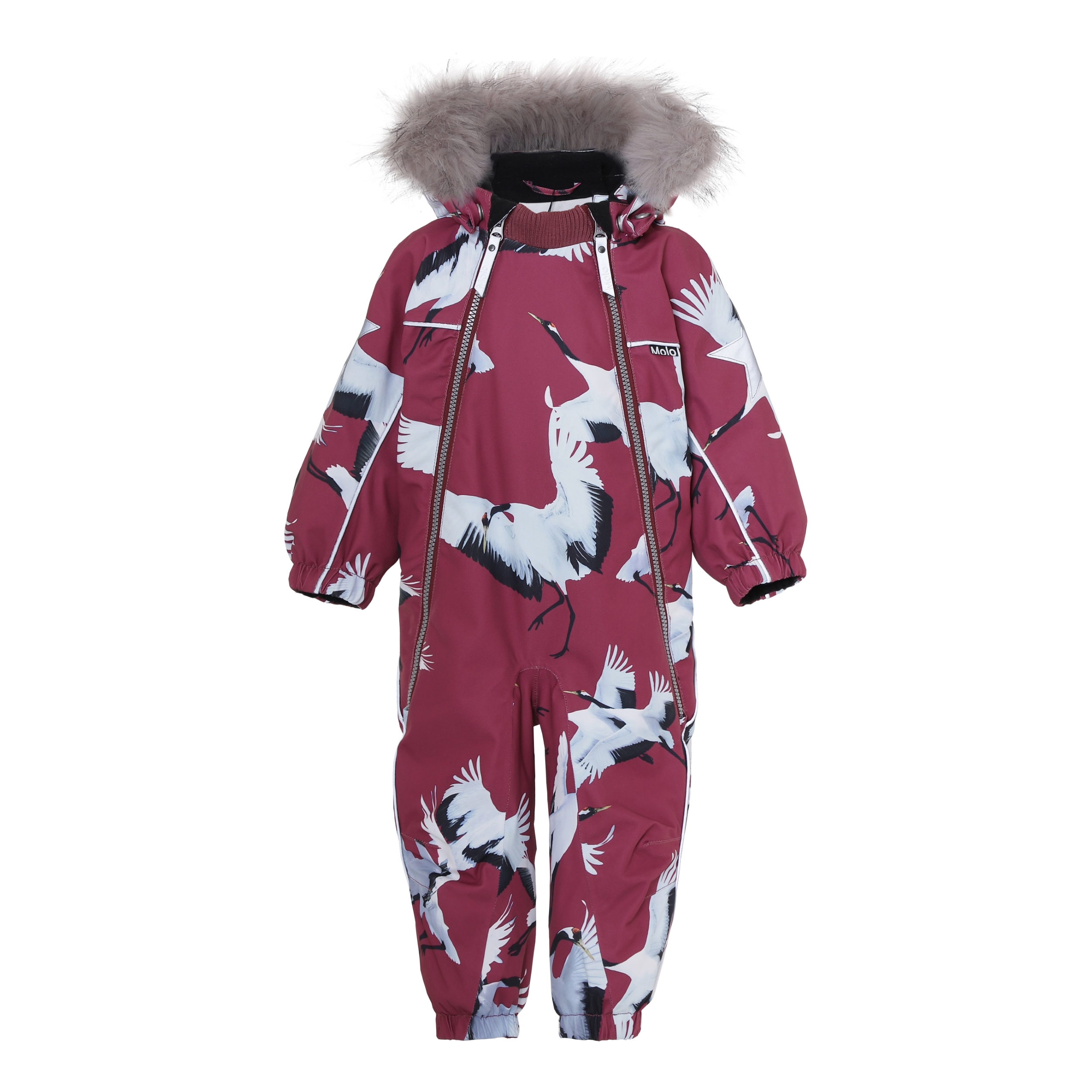 Pyxis is een functioneel bordeaux rode skipak met een print van vliegende kraanvogels voor baby's en kleine kinderen. Het heeft een afneembare capuchon met een rand van nepbont (ook afneembaar), twee schuine ritsen voor het makkelijk aantrekken, sneeuwflappen en rubberen bandjes aan de pijpen en Molo's iconische sterreflectoren bovenaan de mouwen en aan de achterkant van de pijpen. Het sneeuwpak is gemaakt van een winddichte, waterdichte en ademende kwaliteit met 3M ™ Thinsulate ™. Het heeft hoogwaardige fleece op kwetsbare plaatsen en getapete naden. Dit product heeft een waterbestendige, PFC-vrije oppervlaktebehandeling (bevat geen PFOS, PFOA, enz.). Waterkolomdruk: 15.000 mm. Ademend vermogen: 15.000 g / m2 / 24 uur.