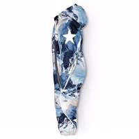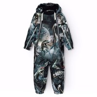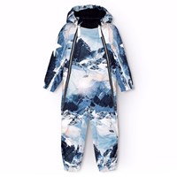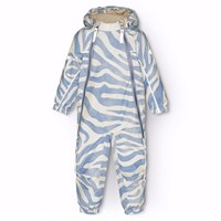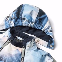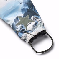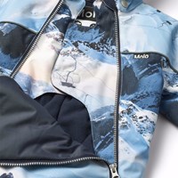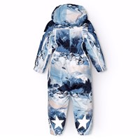 Blauw skipak van gerecycled polyester voor een koude winter met een print van een winterlandschap in verschillende tinten blauw. Het skipak heeft een afneembare capuchon met fleece, twee ritsen met fleece-gevoerde kinbeschermers om te voorkomen dat de huid beschadigd. Het heeft een binnenwindflap en elastiek in de taille, mouwen en pijpopeningen om sneeuw, regen en wind buiten te houden. Het pak heeft reflectoren langs de zijnaden, rond de capuchon en grote ster-vormige reflectoren op zowel de mouwen als de pijpen om de zichtbaarheid in het verkeer te vergroten. Het pak is gevoerd met 3M™ Thinsulate™, wat zorgt voor meer bewegingsvrijheid voor je kind.