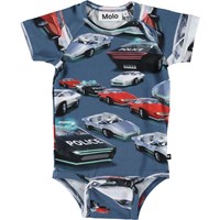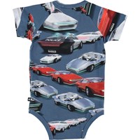 Zelfrijdende auto's zijn de toekomst en ze staan op de print op het Feodor romper met korte mouwen. Feodor heeft drukknopen bij het kruis.