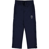 Angie is een donkerblauwe trainingsbroek met een coole knoopsluiting aan de zijkant van de pijpen. Angie heeft zakken en een elastische tailleband met koordjes.