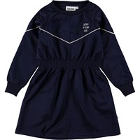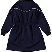 Coletta is een sportieve donkerblauwe jurk geïnspireerd op trainingspakken. Colletta heeft een cool glanzend oppervlak en witte biezen langs de borst.