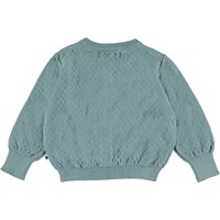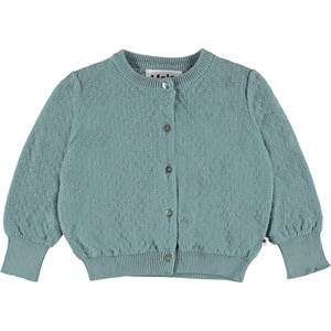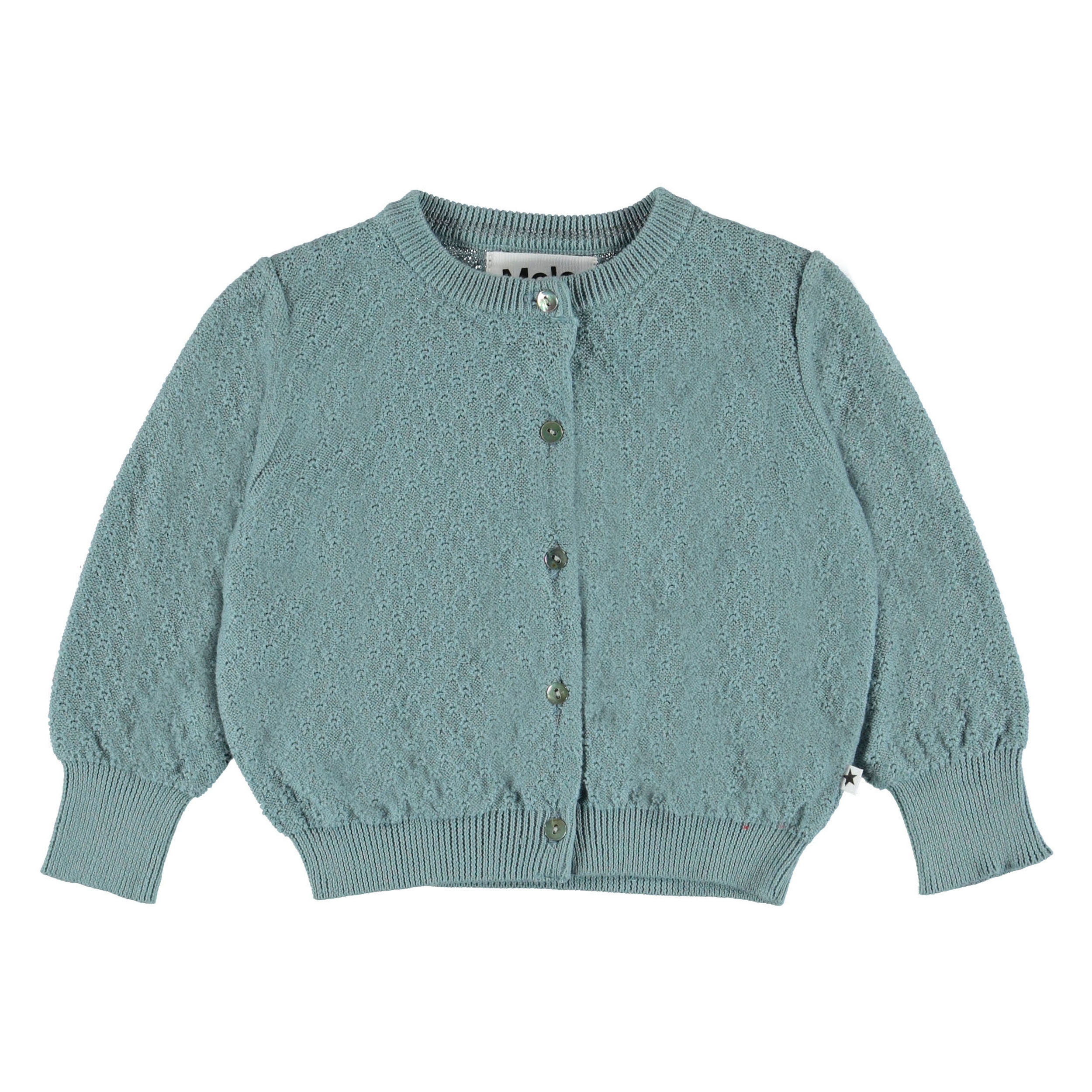 Ginny is een gebreid babyvest met lange mouwen met een lichtblauw naaldenpatroon. Ginny heeft parelmoeren knopen aan de voorkant en rib rond de hals, mouwen en onderkant.