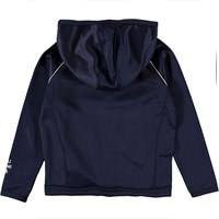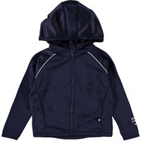 Malin is een trainingsjas in donkerblauw met een capuchon, een ritssluiting en witte biezen.