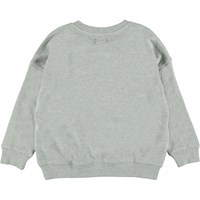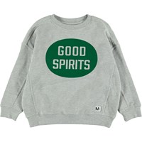 Mieber is een zachte, lichtgrijze trui met hangende schouders. Mieber heeft een groene print met de tekst 'Good Spirit'.