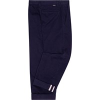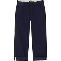 Donkerblauwe katoenen chino met zijzakken en een logolabel in de tailleband. De broek heeft een normale pasvorm en sluit met een haakje. De taille kan worden versteld met een interne elastiek, waardoor het een perfecte pasvorm heeft voor alle kinderen.