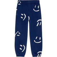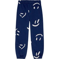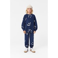 Donkerblauwe joggingbroek van biologisch katoen met een elastische taille, koordjes, elastiek rond de enkels en zijzakken. De broek heeft een normale pasvorm en een all-over print met veel grote witte smileys die draaien en feesten. De broek heeft een gevoerde binnenkant, waardoor het zacht en warm is om te dragen.