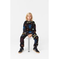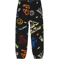 Zwarte biologische katoenen joggingbroek met elastische tailleband, koordjes, zijzakken en elastische boorden aan de enkels. De broek heeft een normale pasvorm en een veelkleurige all-over print. De print bevat verschillende gekleurde stripfiguren, zoals een buitenaards wezen dat op zoek is naar snacks en bananen naar zijn UFO straalt, een kat met een computerscherm als hoofd die naar een computermuis kijkt, en een buitenaards wezen dat een VR-bril draagt. Een levendig patroon met veel leuke details.