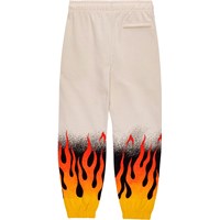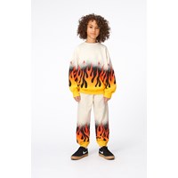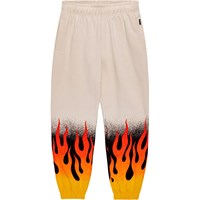 Beige joggingbroek van biologisch katoen met een vlammenprint, een grafisch motief met kleuren die variëren van rood tot oranje tot geel. De vlammen zitten aan de onderkant van de pijpen, waardoor het lijkt alsof de vlammen de pijpen van de joggingbroek likken. Het heeft een normale pasvorm en is voorzien van een verstelbare taille, steekzakken, een achterzak en elastiek bij de pijpen.