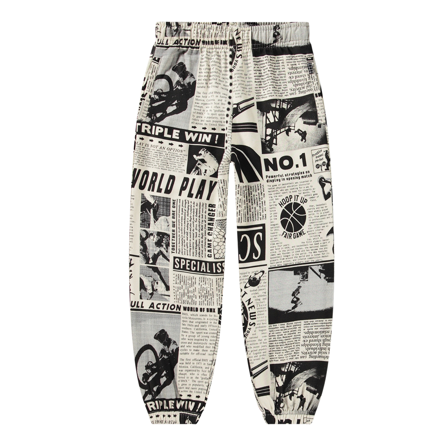 Zwarte en witte joggingbroek van biologisch katoen met een elastische taille, koordjes aan de binnenkant, zijzakken en elastiek rond de enkels. De broek heeft een gevoerde binnenkant, waardoor het zacht en warm is om te dragen. Hij heeft een normale pasvorm en een all-over print van een zwart-witte krantenknipsel met afbeeldingen en artikelen over verschillende sporten.