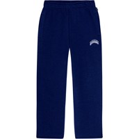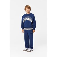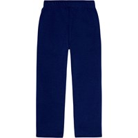 Donkerblauwe joggingbroek van biologisch katoen met een elastische tailleband en koordjes, rechte pijpen en zijzakken. De broek heeft een normale pasvorm en een wit geborduurd woord "Imagine" op het bovenbeen. De broek heeft een gevoerde binnenkant, waardoor het zacht en warm is om te dragen.