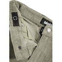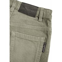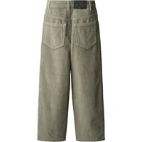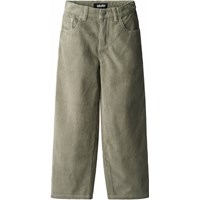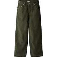Donkergroene broek van geribbeld ribfluweel met vijf zakken, wijde pijpen en een ritssluiting. De broek is geïnspireerd op de skatescene en heeft een relaxte ruimvallende pasvorm.