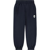Zwarte joggingbroek gemaakt van biologisch katoen met een verstelbare elastische taille, zijzakken, een enkele achterzak en elastiek rond de enkels. De joggingbroek heeft een normale pasvorm en een witte print van verschillende pictogrammen uit de collectie langs de pijpen.