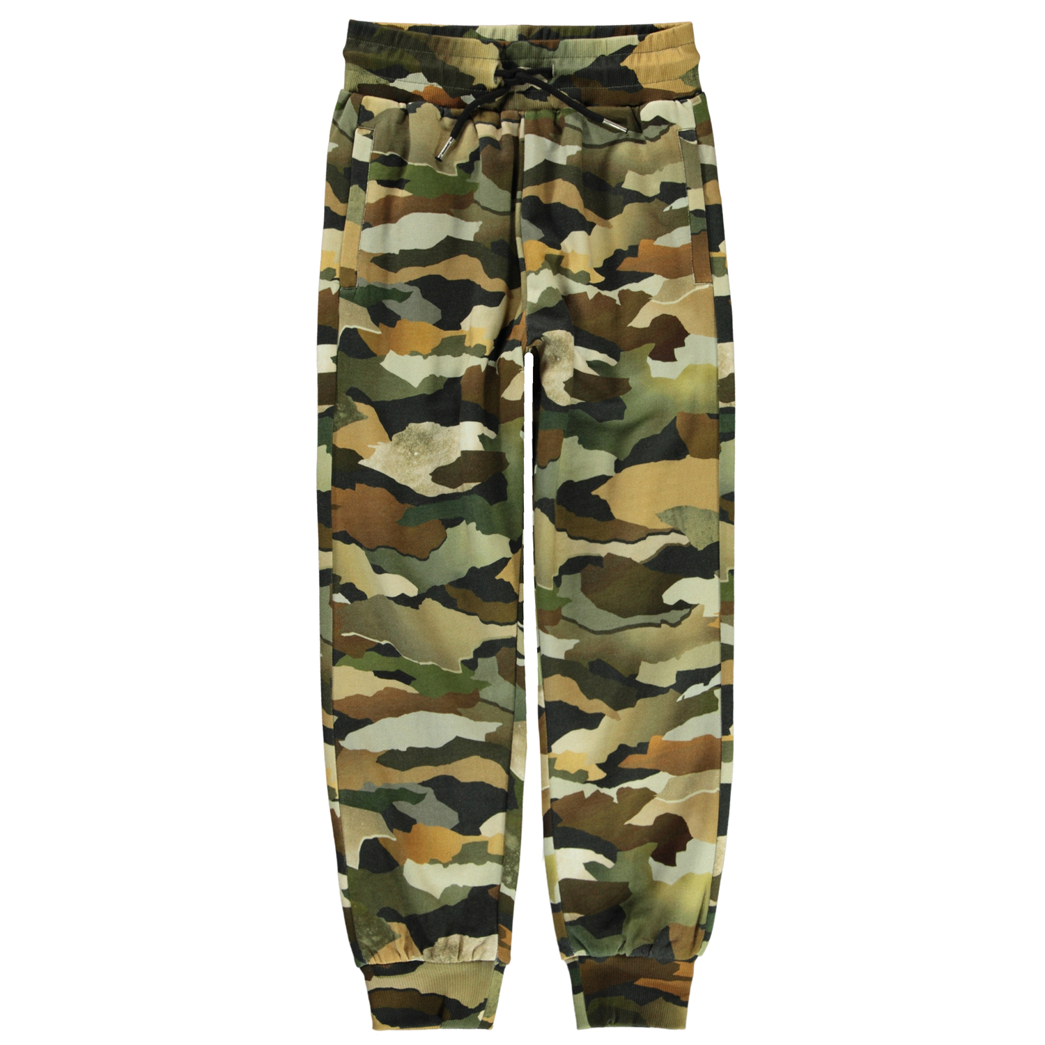 Alvar is een sportieve joggingbroek met een camouflage print. Het heeft een wijde elastische trillen en zakken met een rits.