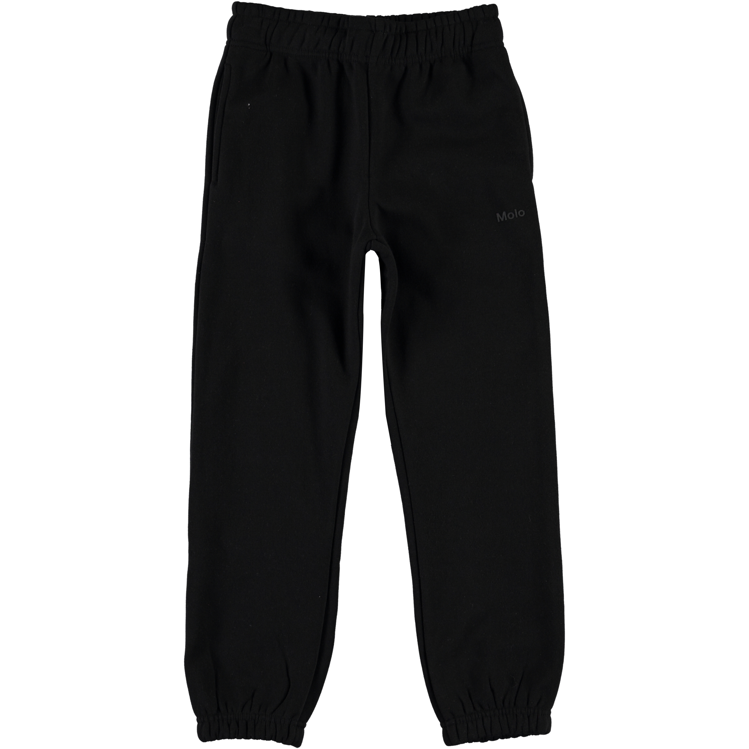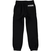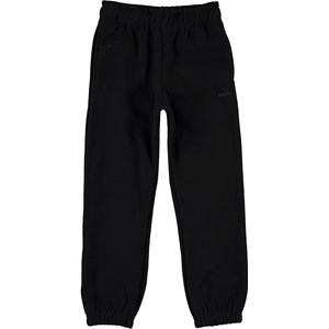 Am is een zwarte trainingsbroek. Het heeft een elastische taille en ribboord aan de pijpen.