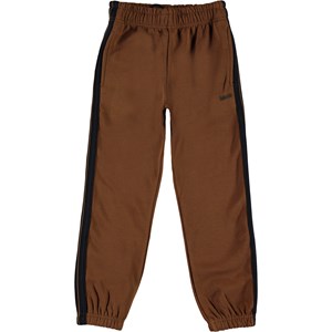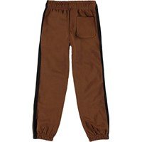 Am is een bruine trainingsbroek met zwarte strepen op de benen. Het heeft een elastische taille en ribboord aan de pijpen.
