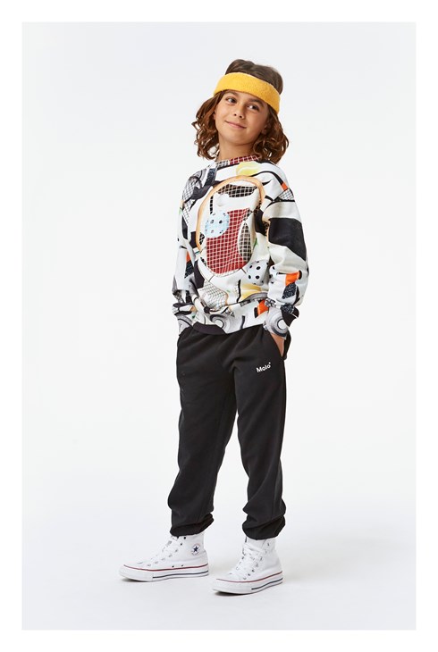 Am is een zwarte joggingbroek met een elastische taille met voor- en achterzakken.