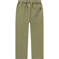 Mosgroene broek van biologisch katoen met een elastische tailleband en koordjes. De broek heeft zijzakken en een ruime pasvorm.