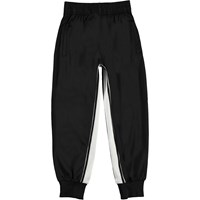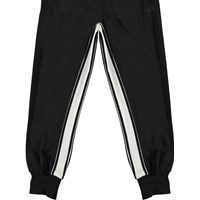 Antoo is een zwarte trainingsbroek met een witte streep aan de binnenkant van de pijpen. Het heeft een elastische taille en ribboord aan de pijpen.