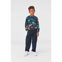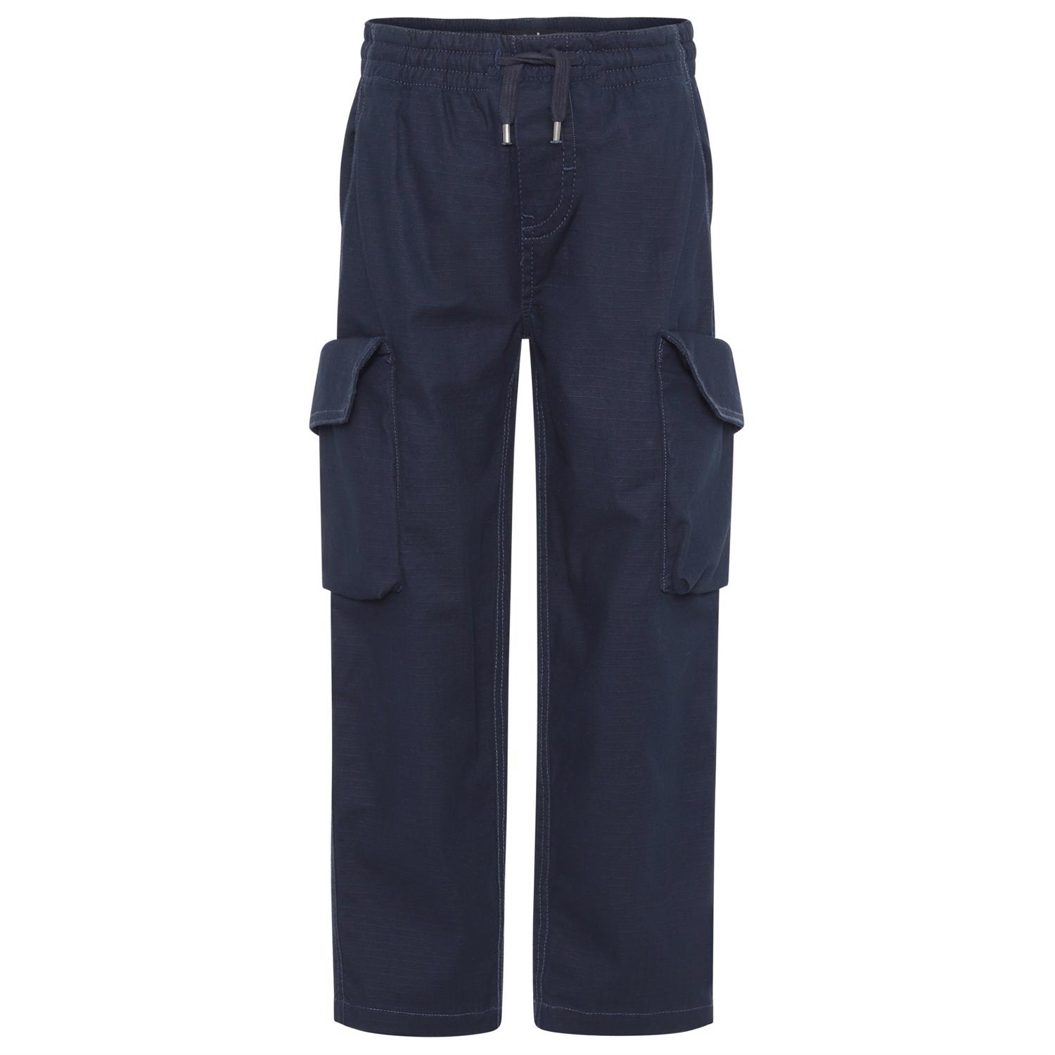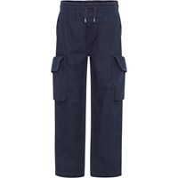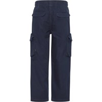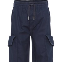 Argo is een donkerblauwe cargobroek in een losse pasvorm met wijde pijpen. Argo heeft grote ruime zakken aan de zijkant van de pijpen. Het heeft een comfortabele elastische taille en koordjes in de taille.