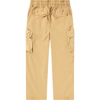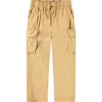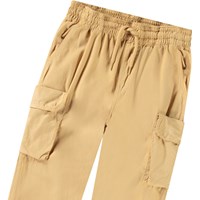 Bruine cargobroek van biologisch katoen met elastische taille, intern koordje en normale pasvorm. De broek heeft achterzakken, zijzakken en een zak op elke bovenbeen.