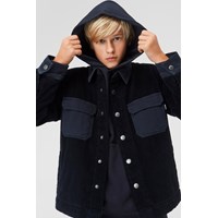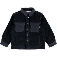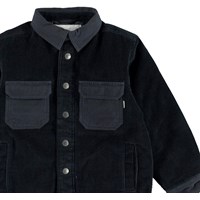 Henley is een donkerblauw jas van corduroy. De jas heeft voorzakken op de borst, een kraag en het heeft een knoopsluiting. De jas heeft steekzakken.
