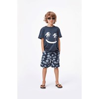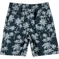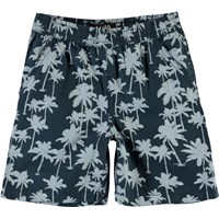 Acton is een donkerblauwe short met een print van lichtblauwe palmbomen. ZHet heeft een elastische tailleband met koordjes voor een goede pasvorm.