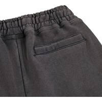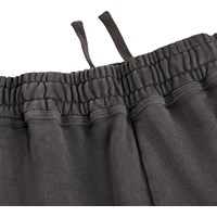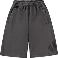 Zachte donkergrijze korte broek met een print gemaakt van biologisch katoen. De korte broek heeft een ruimvallende pasvorm en komt tot rond de knie. Het heeft zijzakken, een achterzak en elastiek met een koordje in de taille, wat het comfortabel en gemakkelijk maakt en bewegingsvrijheid geeft.